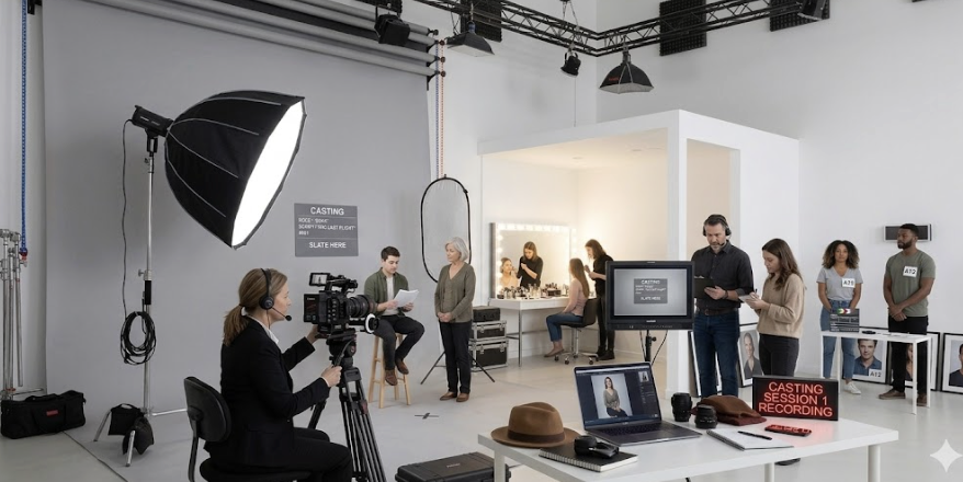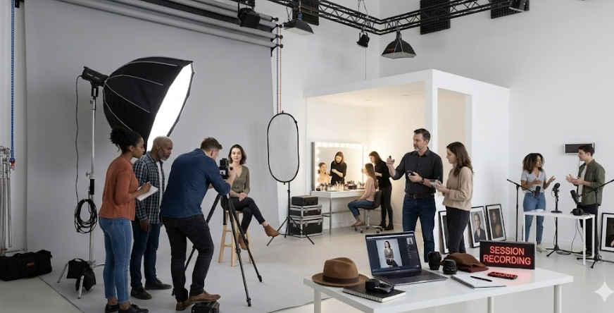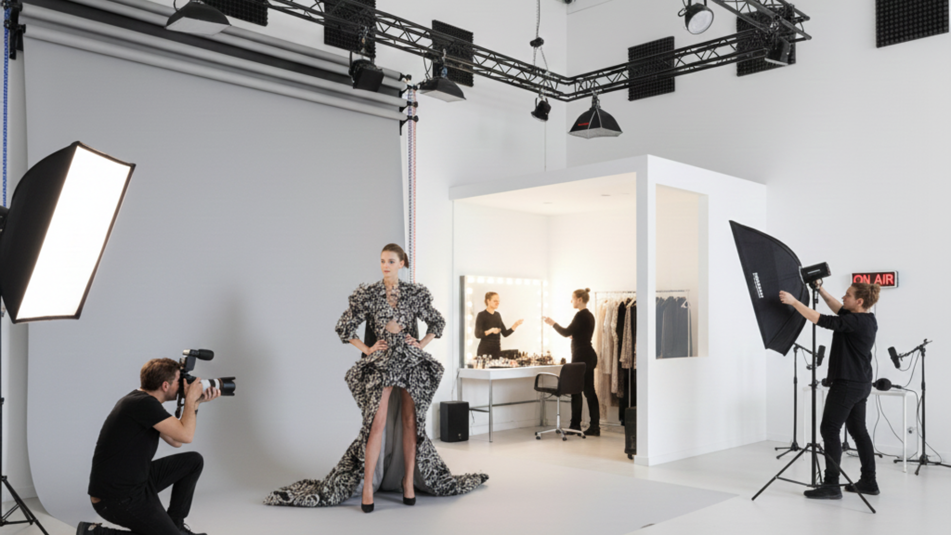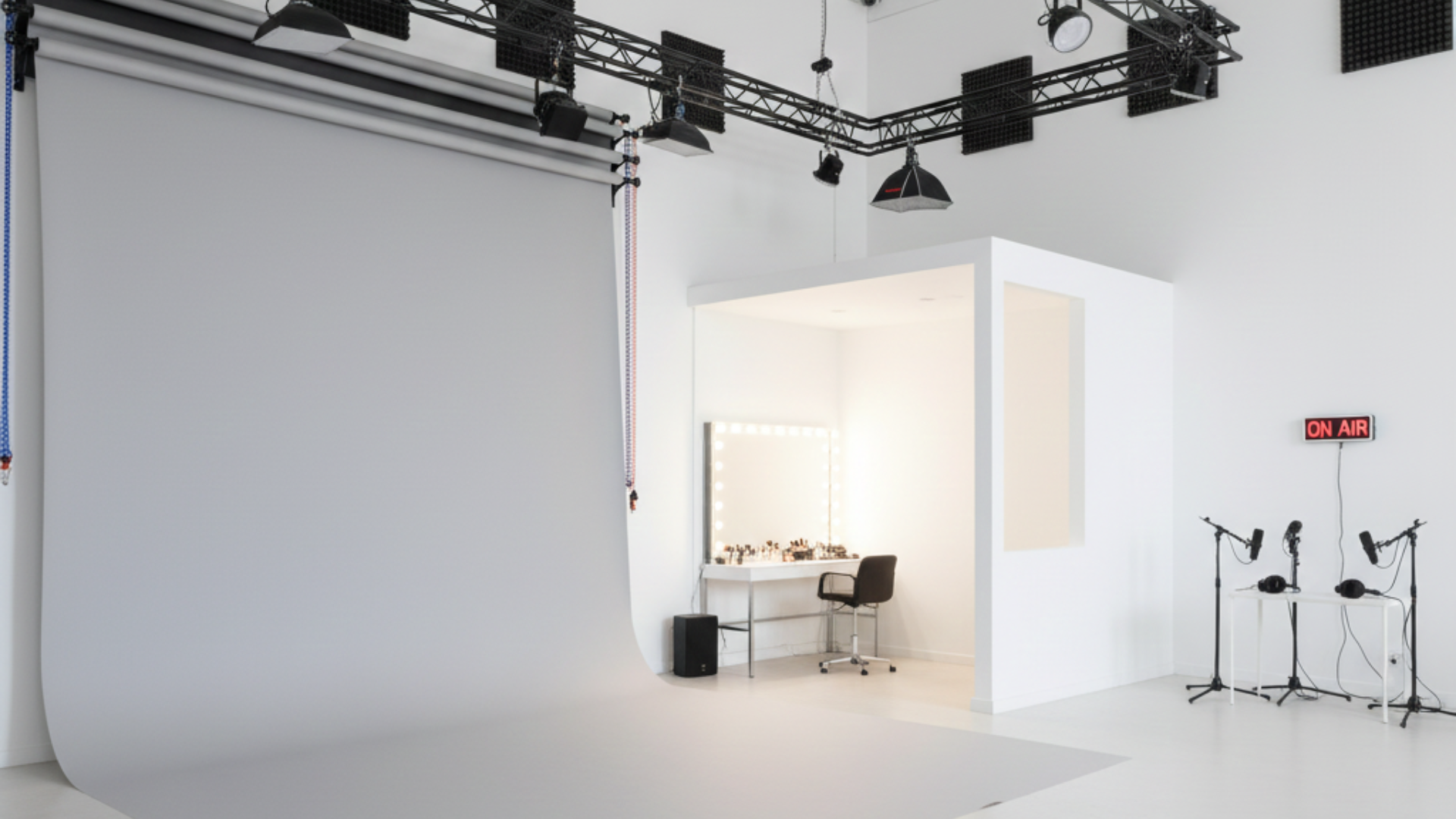 Espacio de techos altos y paredes blancas mate para evitar reflejos. Equipado con ciclorama de papel, rieles de iluminación ajustables y área de maquillaje. El ambiente es silencioso y cuenta con tratamiento acústico básico para grabaciones de podcast.