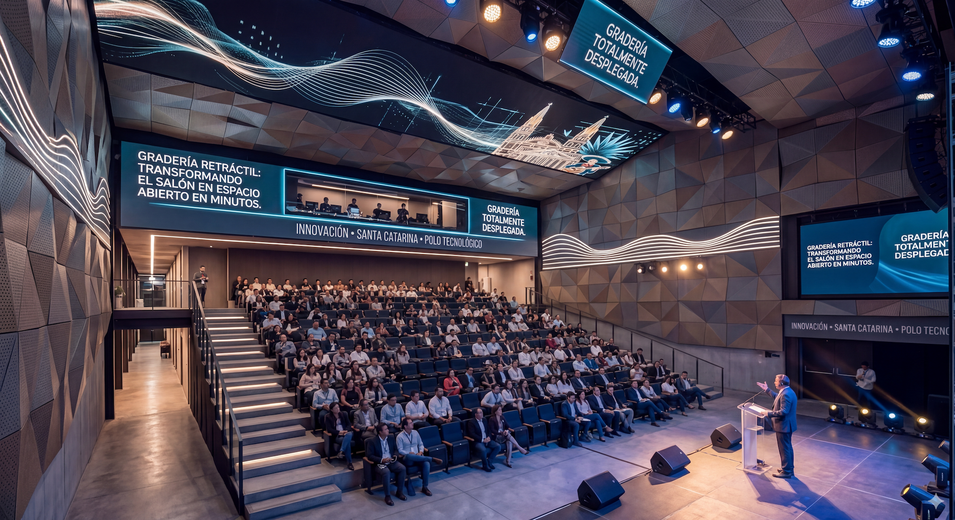 Ubicado en el polo tecnológico de Santa Catarina, este auditorio rompe con lo tradicional. Cuenta con una gradería retráctil que permite transformar el salón en un espacio abierto en minutos. Los muros tienen un tratamiento acústico de alta gama, garantizando que cada palabra del ponente llegue con nitidez absoluta.
