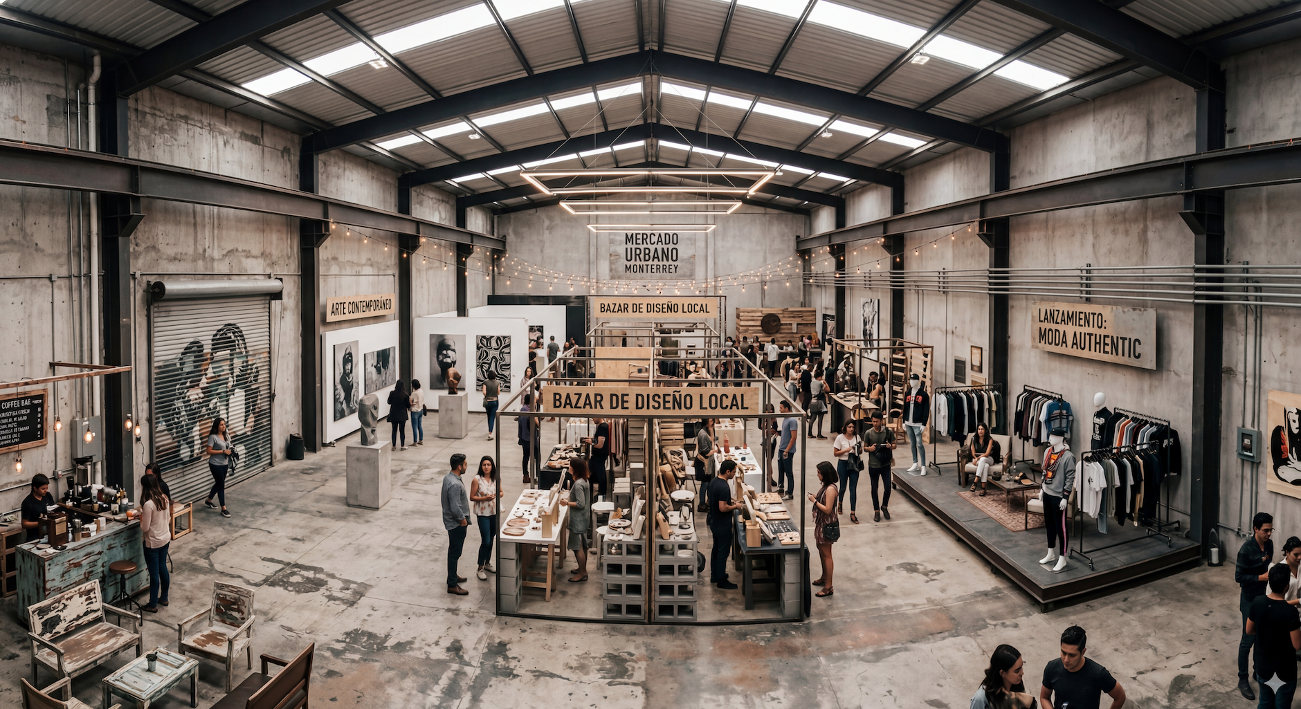 El epicentro del comercio local y la cultura urbana. Un galerón industrial de 450 m² con estética raw (concreto expuesto y vigas de acero). Su diseño diáfano permite una circulación fluida, ideal para bazares de diseño, exposiciones de arte o lanzamientos de marcas de moda que buscan un aire auténtico y rústico.