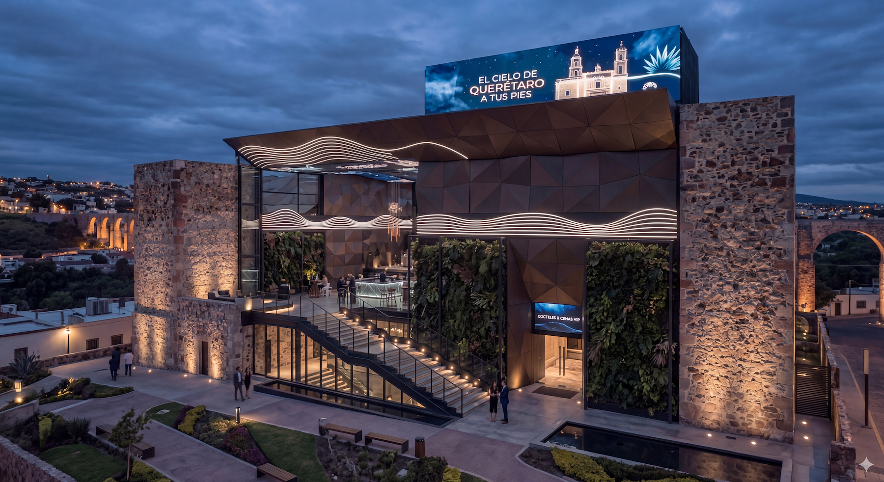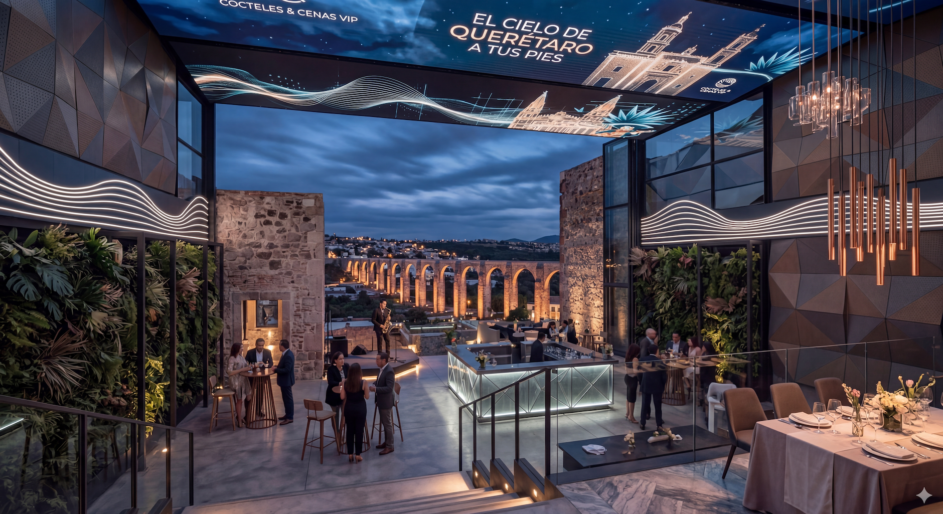 "El cielo de Querétaro a tus pies." Una joya arquitectónica que combina la piedra histórica de la ciudad con un diseño contemporáneo de cristal y acero. Rodeada de jardines verticales que brindan una privacidad natural, esta terraza ofrece la vista más espectacular a los Arcos, convirtiendo cualquier brindis en un momento cinematográfico.