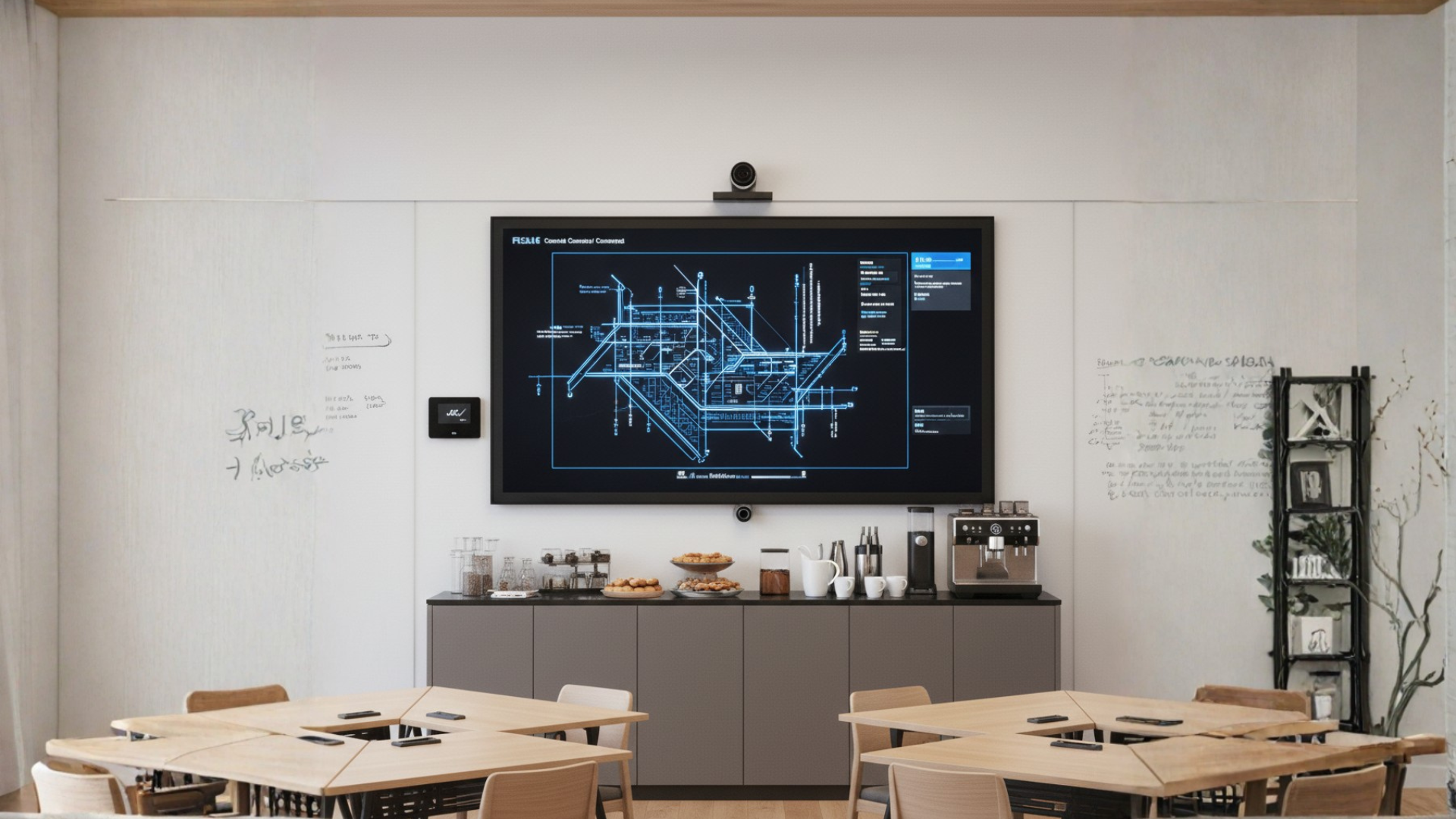 Pantalla Inteligente 4K de Gran Formato: El corazón de la sala es una pantalla digital de última generación con resolución ultra alta, diseñada para presentaciones interactivas, visualización de planos complejos y videoconferencias inmersivas. Su tecnología antirreflejante garantiza una visibilidad perfecta desde cualquier ángulo del salón.