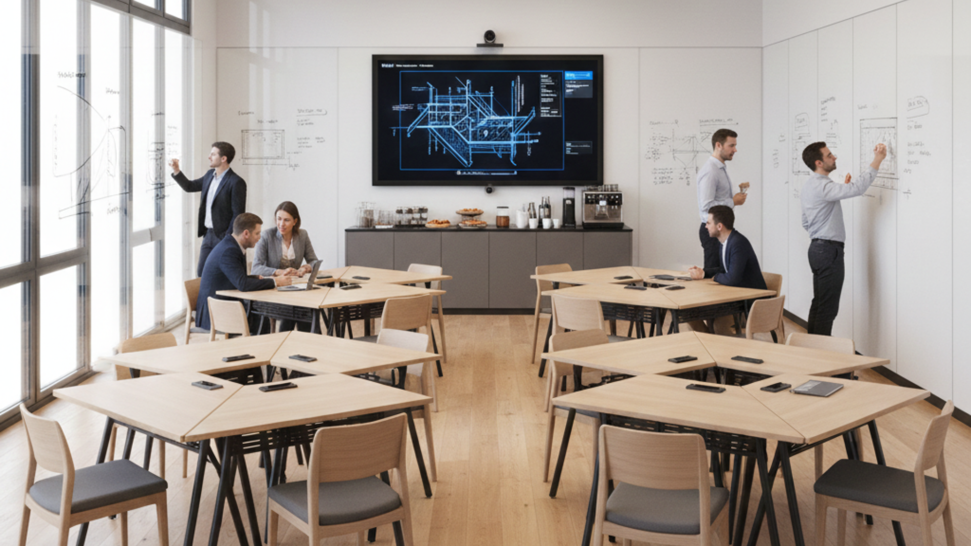 Herramientas de Colaboración Analógica: Los muros laterales funcionan como pizarras blancas de gran formato, permitiendo capturar ideas al vuelo mientras se mantiene la presentación digital como guía central.